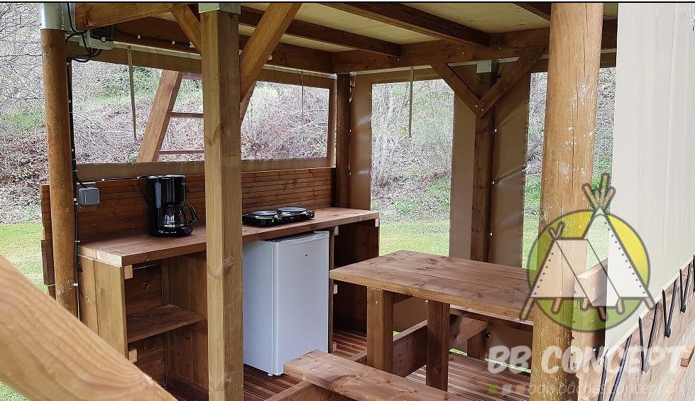 Las tiendas cuentan con vajilla para dos personas, un colchón 2x 1 plazas, un refrigerador, electricidad y 1 quemadores de gas (proporcionados) para cocinar.